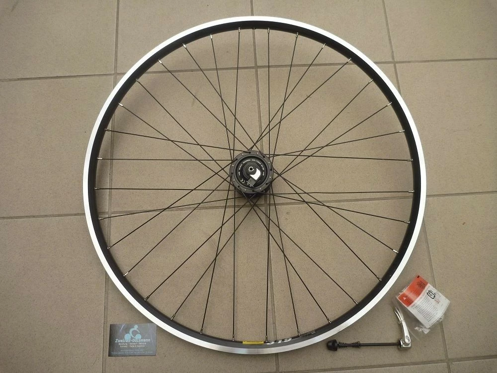 Vorderrad mit Schnellspanner und Leitungsstecker. Vorderrad wurde nachzentriert, abgedrückt und die Nippel verklebt.
