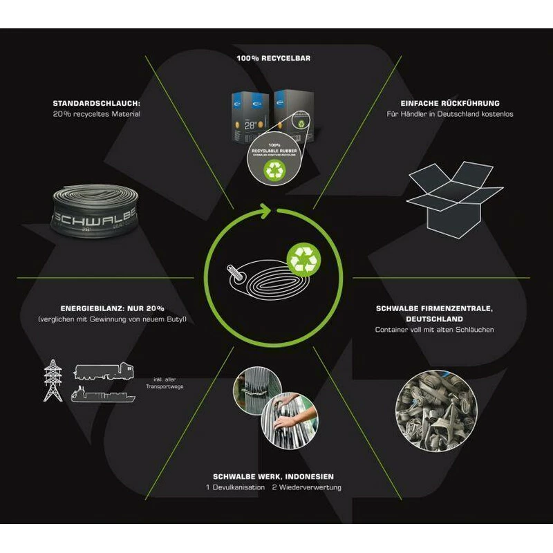 Wegen ihrer exzellenten Fertigung bewähren sich Schwalbe Schläuche seit Jahren auf dem Markt. Sie sind gleichmäßig in der Wandstärke und rund im Lauf. Durch ihre präzise Fügung sind sie in der Naht haltbar. Ein Vergleichstest ergab: Der Schwalbe-Schlauch hält den Luftdruck deutlich länger stabil als andere Schläuche (diese verloren in 30 Tagen fast doppelt so viel Luftdruck wie der Schwalbe-Schlauch). Ein möglicher Grund dafür könnte ein niedrigerer Butylanteil bei den anderen Schläuchen sein. Die besondere Qualität der Schwalbe Schläuche ergibt sich aus der Einzigartigkeit ihrer Gummimischung. Um diese hohe Qualität zu gewährleisten, wird jeder einzelne Schwalbe Schlauch für mindestens 24 Stunden aufgepumpt und kontrolliert, bevor er das Werk velässt.